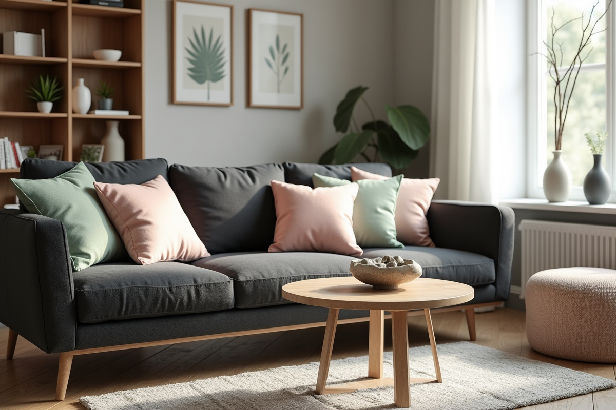 Les amateurs de canapé gris style minimaliste privilégient souvent des coussins écru, lin ou sable. Ces tons naturels soulignent la sophistication du canapé sombre et allègent l’ensemble. Ceux qui aiment sortir des sentiers battus osent le lie-de-vin, le vert céladon ou même une touche de corail pour installer un contraste inattendu.